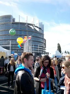 Soleil bleu, vent léger, un groupe de chanteurs qui fait résonner l'hymne européen en beatbox – le cadre d'ouverture de l'EYE est idyllique. Après les discours du maire de Strasbourg, de la vice-présidente du Parlement européen et du directeur de l'European Youth Forum, les yeux des milliers de participants du festival se tournent vers l'allée menant au parlement, où flottent les drapeaux des 28 pays membres. Le drapeau européen se hisse, lentement, sous les acclamations du public, assurément ému.
