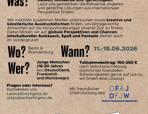 A travers des ateliers créatifs, des visites de projets, une pédagogie de l'expérience et des médias et un apprentissage interculturel, nous souhaitons découvrir ensemble les opportunités offertes par les médias (sociaux) pour un avenir respectueux du climat ! Que vous ayez ou non du talent, une expérience préalable ou des connaissances linguistiques : La salle est ouverte à tous. Les participants à la phase en Allemagne ont une place assurée pour la phase de continuation au Monténégro.