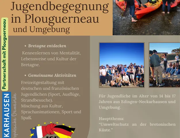 Chaque année, l’IGP e.V. organise avec le Comité de Jumelage un échange de jeunes dans nos deux communes jumelles. Il s’agit de deux rencontres de deux semaines, organisées en été. Les jeunes d’Edingen-Neckarhausen et de la région sont invités à découvrir Plouguerneau et rencontrer des adolescents de leur âge, puis les jeunes Plouguernéens se rendent dans notre commune pour une seconde rencontre. Certaines années, nous proposons également des rencontres franco-allemandes en tiers-lieux afin de faire découvrir aux participants d’autres régions de France et d’Allemagne.