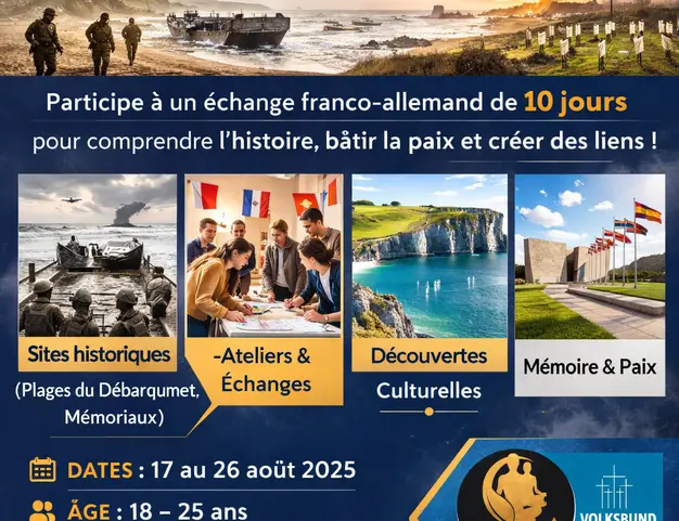 Ce projet franco-allemand en Normandie propose à 24 jeunes Français·es et Allemand·e·s de se rencontrer et de réfléchir ensemble à l’histoire de la Seconde Guerre mondiale à travers des visites de lieux emblématiques du Débarquement et des ateliers interculturels. Il vise à mieux comprendre les enjeux de mémoire, les conséquences de la guerre sur les populations civiles et les différentes cultures du souvenir. À travers une pédagogie participative, les participant·e·s développent leur esprit critique, leurs compétences interculturelles et leur engagement citoyen en faveur de la paix en Europe